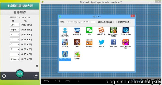 新弹出的保存按钮会显示你模拟器内几经安装过的应用(前提是你已经安装了模拟器),你点击游戏的图标,会自动生成要保存的文件名,(生成的脚本的名称,每个游戏都不同,是一一对应的) ,有了文件名你可以直接导入到安卓模拟器里,也可以保存到其它位置然后分享给你的朋友。