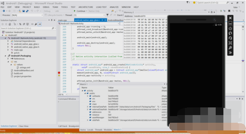 7、最后在Visual Studio 2015进行android native activity开发时进行调试的效果图: