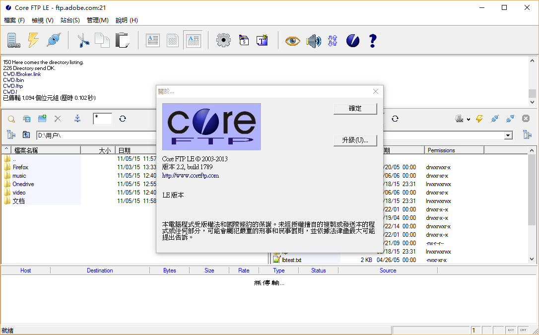 Core FTP LE 支援FTP、SSL、TLS、FTPS安全连线的免费FTP Client - Core FTP LE,支援站台对站台对传、Mode Z压缩、档案拖放功能、传输流量限制、.htaccess及档案线上编辑、我的最爱功能、命令列指令...等等,是一套功能强大且欢迎的FTP用户端软体。