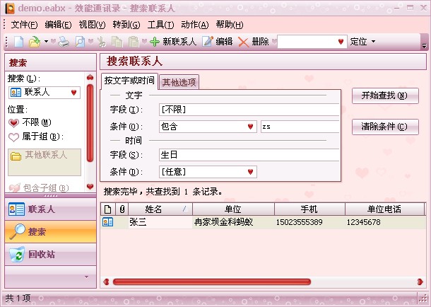 效能通讯录是一款专业、美观、易用的联系人及客户信息管理软件。软件支持无限级别的联系人分组,帮助您快速管理成千上万的联系人信息;特有拼音首字母自动识别功能,帮助您最快地查找到相关信息;您可以按公历或农历输入联系人的生日和纪念日,软件会实时贴心提醒,帮助您更好地建立人脉和客户关系;通过设置联系人的重要性帮助您时刻把握重点;自定义字段充分满足您的特殊业务需求。效能通讯录的一大特色是,对于联系人的备注,您不仅仅可以输入文本信息,还可以象word一样插入附件、表格、图片、超链接等信息,真正做到完整地记录和跟踪联系