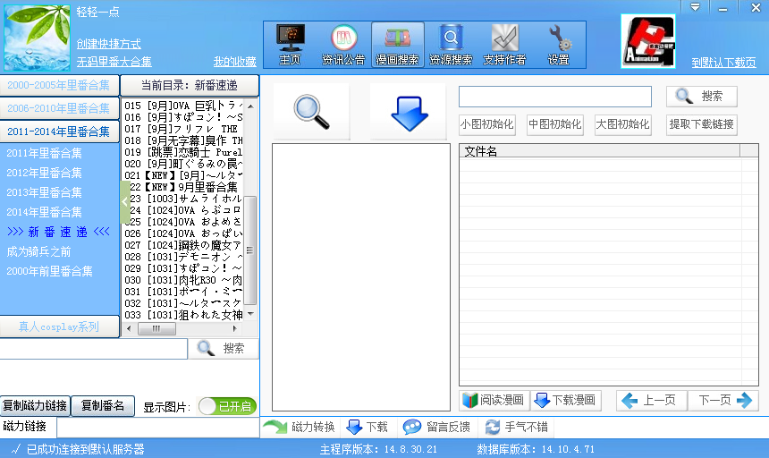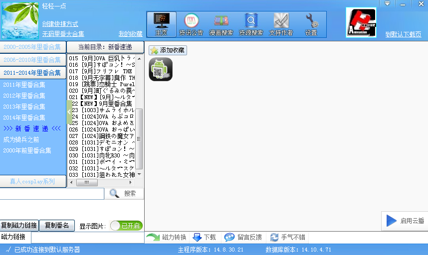 轻轻一点(里番神器)主程序最新版本为15.6.12.29,数据库版本更新至15.6.9.121。此版为轻轻一点(里番神器)2015最新版本。轻轻一点是一个包含日本动漫及岛国真人Cosplay系列视频的资源搜集、在线播放、下载的工具。集合了2000年-2015年所有里番大合集。数据库不断持续更新,新番速递,带你看最新视频。轻轻一点 里番神器,献给懂得的人!