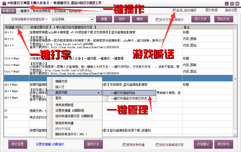 10倍速打字神器是一款绿色免费的快速打字工具,它堪称是懒人必备神器,它通过快捷键打字,可以提高十倍打字速度,另外它还支持一键喊话、一键运行程序、快速注册、快速发贴、快速登陆、一键翻译、一键搜索、网址管理、文件及文件夹管理等等,是一款提高工作学习游戏生活效率的必备工具。