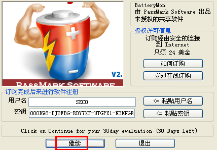 初次运行BatteryMon,会跳出软件注册界面,直接点击“继续”按钮即可